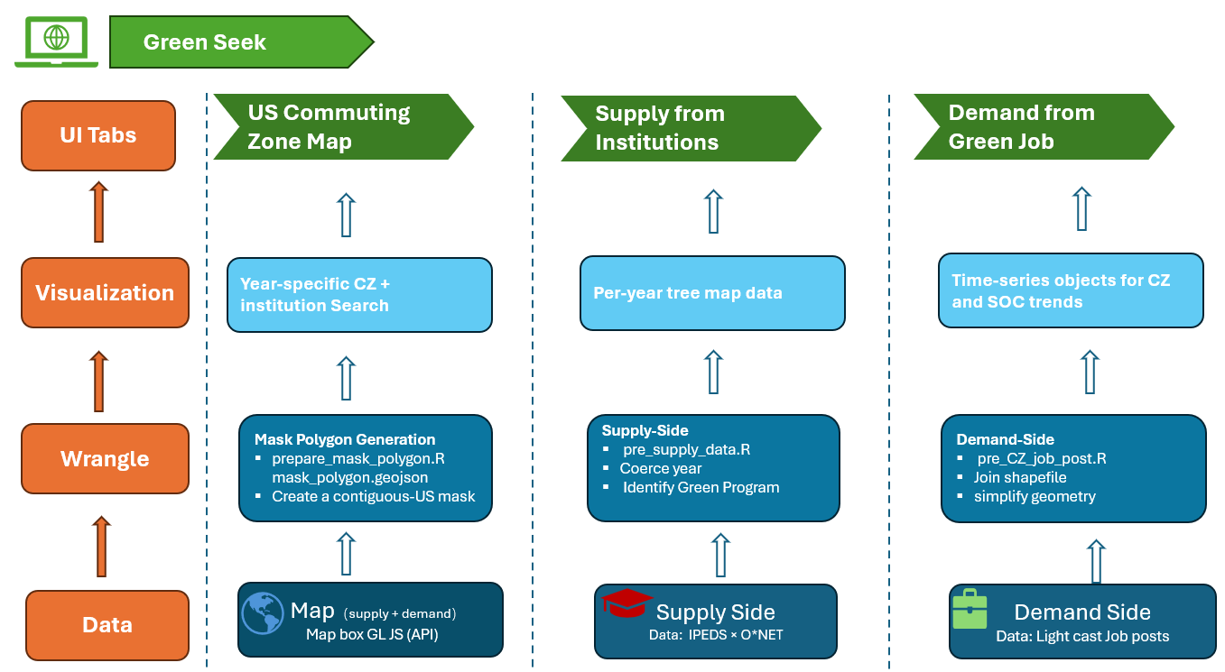 The analytic pipeline consists of several R scripts that perform data wrangling, JSON export, and visualization preparation. The key components are: - Supply-Side Wrangling: pre_supply_data.R reads ccrc_cip_comp.dta, coerces year to numeric, sorts institution names, and writes ccrc_cip_comp.rds for downstream use. - Demand-Side Wrangling: pre_CZ_job_post.R loads Lightcast CSVs (filtered GREEN == 1 for 2010–2023), aggregates postings by county/SOC, joins to county20 and CZ2020 shapefiles, simplifies geometries (dTolerance = 0.05), and saves CZ_job_post.rds. - Mask Polygon Generation: prepare_mask_polygon.R fetches U.S. state boundaries via rnaturalearth, unions them, computes the geometric difference from a world polygon to mask out non-contiguous areas, and exports mask_polygon.geojson. - GeoJSON Exports for Front-end: pre_cz jason.R writes per-year CZ GeoJSON files (CZData_<year>.json) from CZ_job_post.rds. Pre_supply_json.R converts ccrc_cip_comp.rds into point SF, selects instnm and inst_perc_green_tot, and exports InstituteData_<year>.json for each year. - Visualization Preprocessing: Pre_treemap.R aggregates green completions by program title, builds a per-year Plotly treemap list (Green_degree_treemap_plotly_list.rds). Pre_Plotly.R computes time-series of green job proportions by CZ and by SOC, converts ggplots to Plotly objects, and writes p_CZ_plotly.rds & p_SOC_plotly.rds.